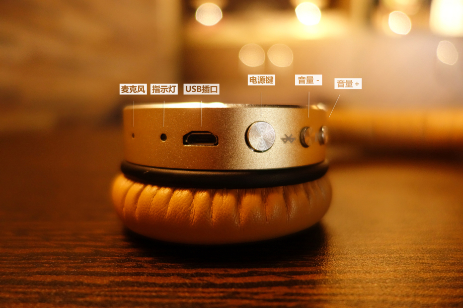 耳机的功能按钮与开孔设计在左侧音腔底部偏后处,在正面只能看到麦克风开孔,横着看依次是麦克风、指示灯、USB插口、电源键(多功能键)、音量加与音量减。按钮使用CD纹设计,按键手感较为一般,在使用两三次之后就能轻易实现“盲操作”。各部分的用处如下:麦克风:通话或录音用,接收音频。指示灯:指示电量与耳机状态,充电时红灯亮起,充电完毕红灯会熄灭,耳机未与手机配对时红蓝灯光快速交替闪烁,配对后蓝灯缓慢闪烁。USB插口:为耳机充电用。电源键(多功能键):长按3秒可以开关机,在播放音乐时单击可以暂停或播放,来电时单击接听电话,通话时单击挂断电话。音量加:单机增加音量,长按播放上一首。音量减:单机减少音量,长按播放下一首。