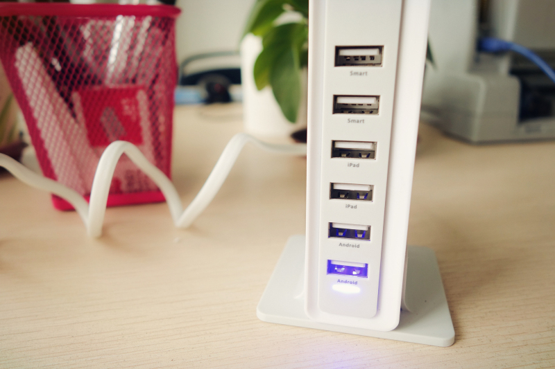 U站使用了USB智能充电芯片,可以通过自动识别充电设备,匹配最佳的电流方案。最高支持8A输出电流,单孔最高输出电流为2.4A。电源线使用了无极性的插头,一米五的长度使U站可以随意放置而不用担心电源线过短。