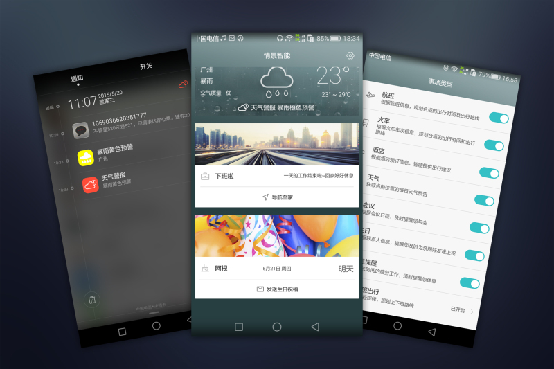 如果说“真正的科技就是让你感觉不到科技的存在”这句话是一种理念的话,那EMUI就是这种理念的实现方案,在EMUI3.1里加入的智能情景,便是可以让人感觉不到科技的存在,根据个人需求,可以让好友的生日、上下班出行路线、休息提醒、航班酒店订单等信息自动设置为提醒事项,当收到有关航班的短信时,系统会在后台智能识别出航班的详细信息,为用户定制一个专属的提醒事项,真正的让用户感觉不到科技的存在。