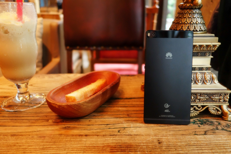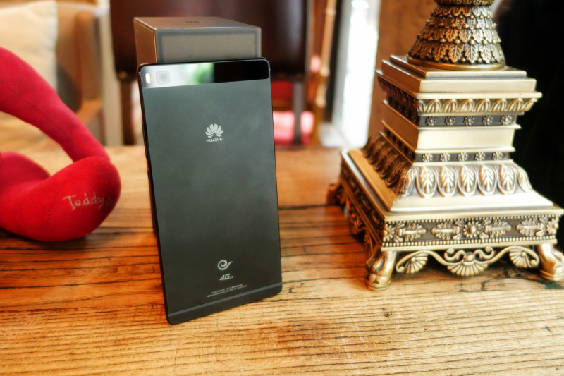 P8使用了铝合金一体成型机身,金属占据了背面的大部分区域,P8背面采用了喷砂工艺处理,肉眼看起来有种哑光的质感,相比起iPhone6那种细腻光滑的背面不同,P8机身表面的颗粒会明显大一些,拿在手上的也不会像iPhone6那么滑。机身背面上方是一块长方形玻璃片,盖住了摄像头和天线,正方形的摄像头开口,在玻璃片的覆盖下,将摄像头完全做平,在摄像头左侧配备了双色温闪光灯。